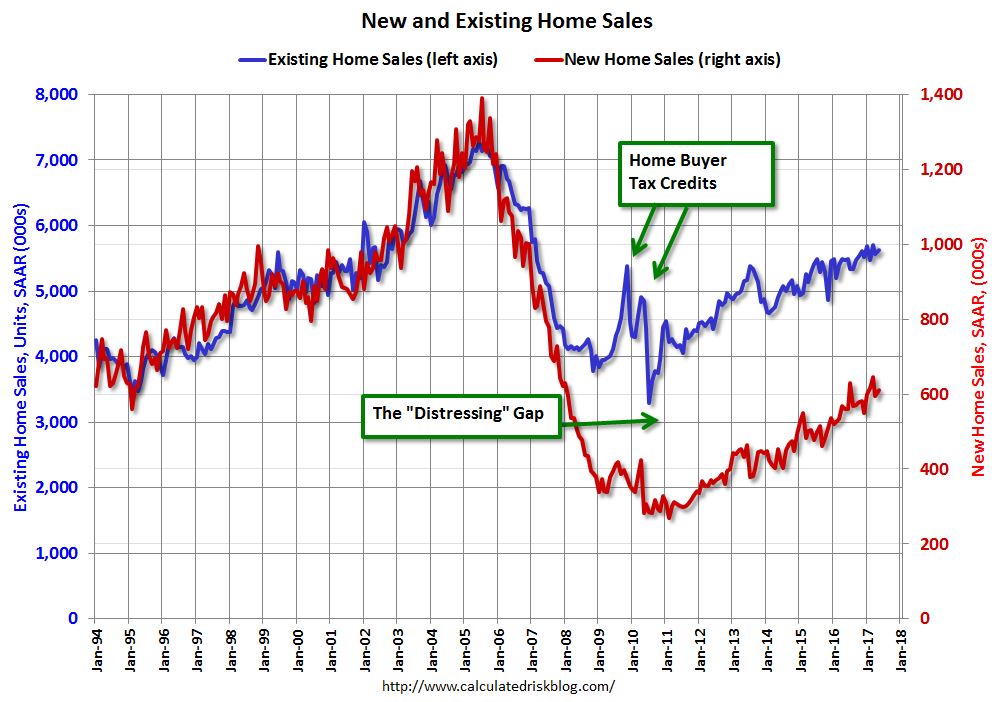 2. Check out Bill McBride’s charts of the “distressing gap” and Normal Equity vs. Distressed Sacramento Real Estate Sales. Also some more interesting new home charts. New home construction and sales used to be tightly correlated with existing home sales. A gap opened up when the bubble burst, and it seems to be gradually reconverging, but extremely slowly. It took a long time to move the pig through the python, and in the mean time, the big and fundamental drivers of the economic transitions of our era have continues playing out and moving along their trend lines, so the recovery is not to how things were before, but to a new equilibrium. It’s not appropriate to attribute the effects of these big changes – which, again, are happening all over the world – mostly to building rates. I’m often surprised that “correcting analysis of changes in local data with global average trends” is not a more common technique in mainstream economic scholarship. By not doing so, people studying exclusively US data are taking an intellectually perilous “we are the world” approach.